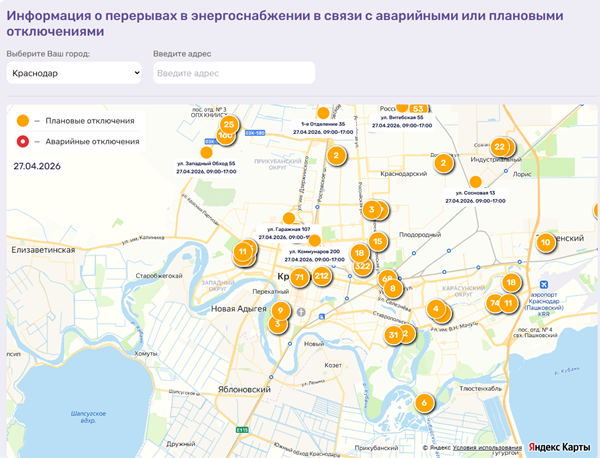 2. Найдите на карте ваш район или адрес - зона отключения выделена цветом (см. легенду: желтым цветом выделены плановые отключения, красным цветом - аварийные отключения.