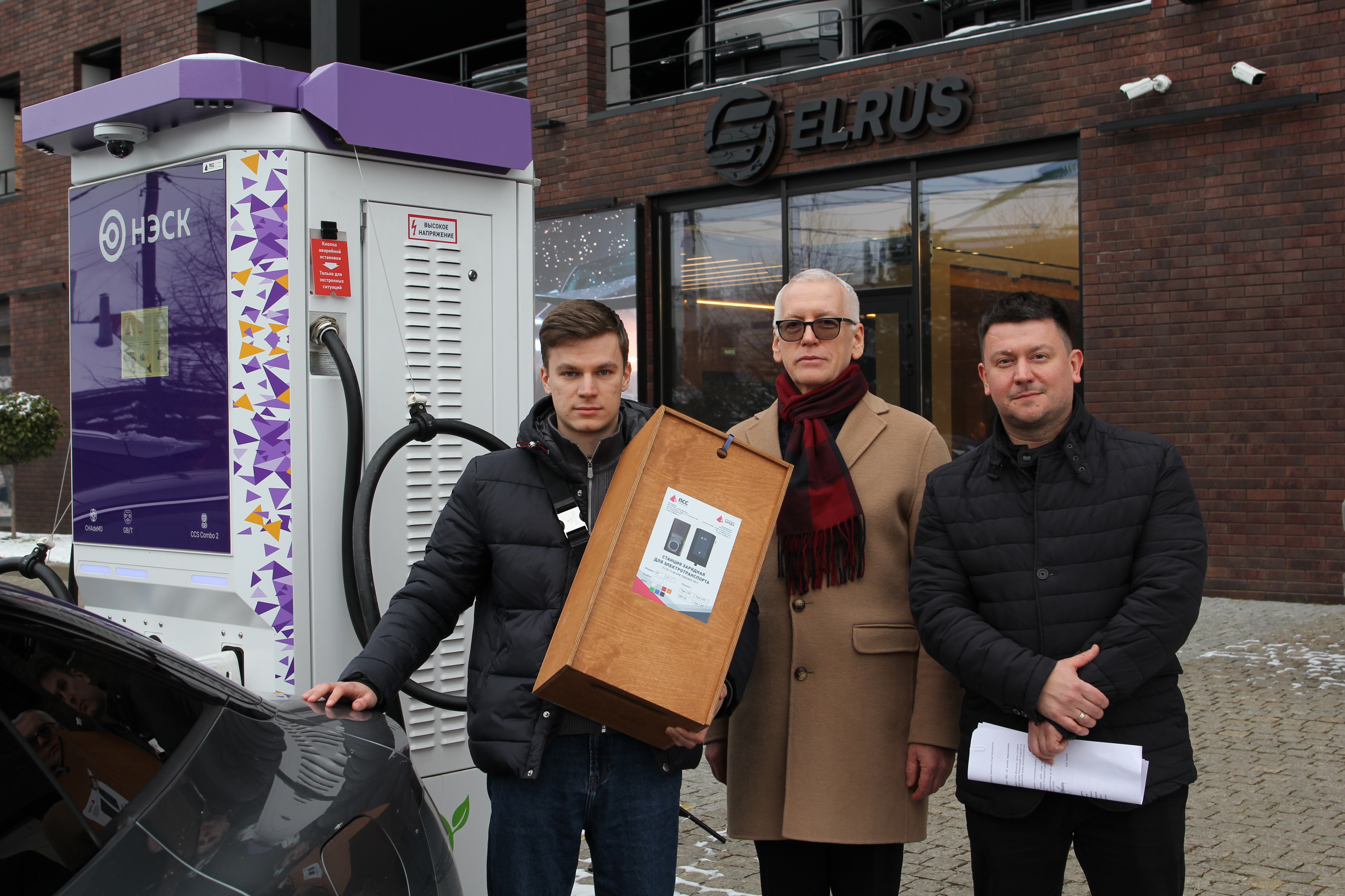 17 февраля директор по техническим вопросам АО «НЭСК» Рюмин В.В. и начальник отдела услуг ЭЗС Пруша Д.Ю. вручили победителю главный приз акции – домашнюю зарядную станцию.