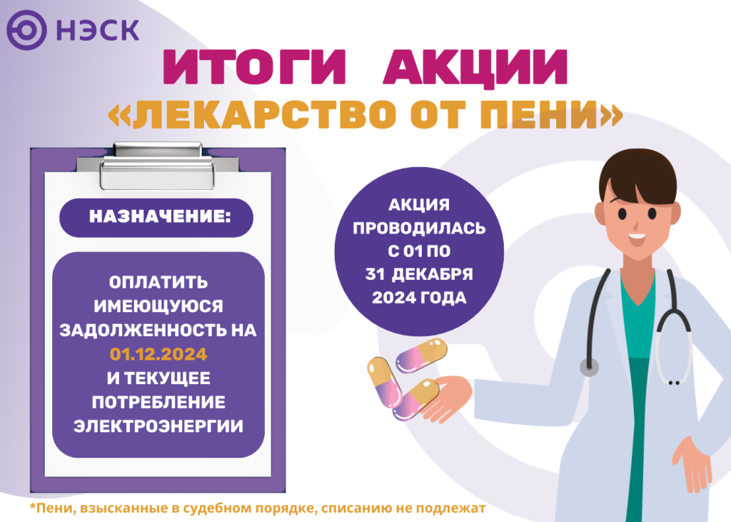 Акция «Лекарство от пени» проводилась АО «НЭСК» с 01 декабря по 31 декабря 2024 года.